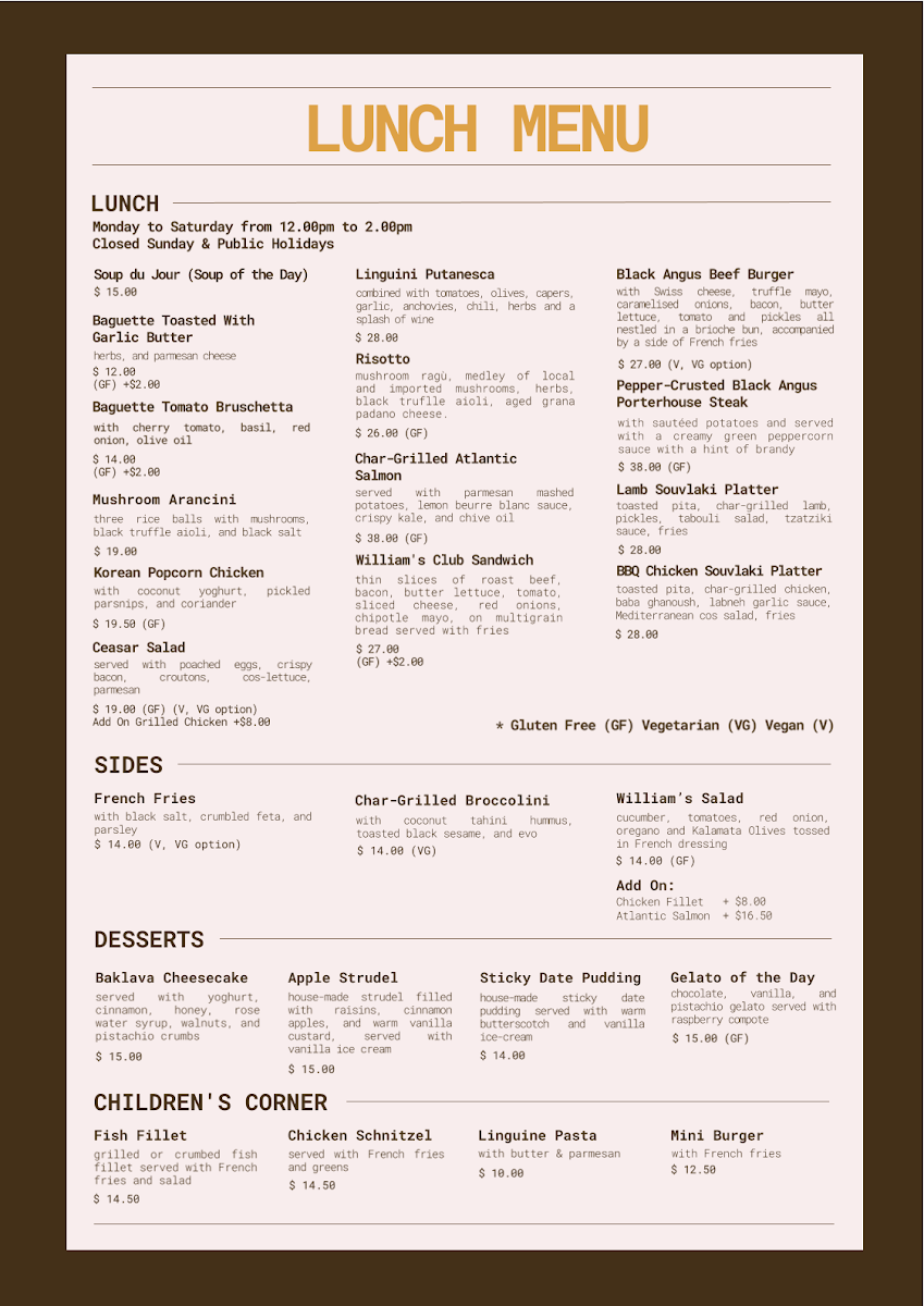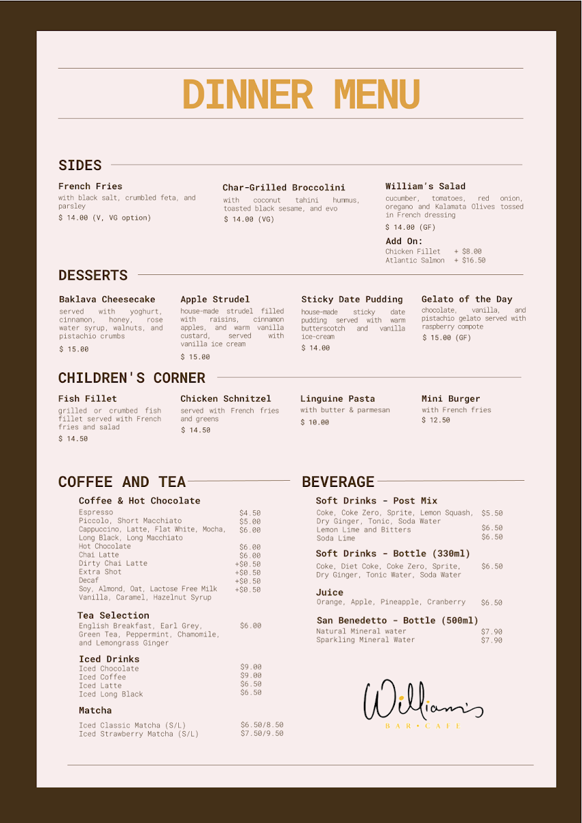 Welcome to Williams Bar & Cafe, a delightful eatery nestled in the heart of Melbourne on William Street. This restaurant truly excels in offering a diverse menu that caters to everyone, from indulgent desserts to hearty dinners.